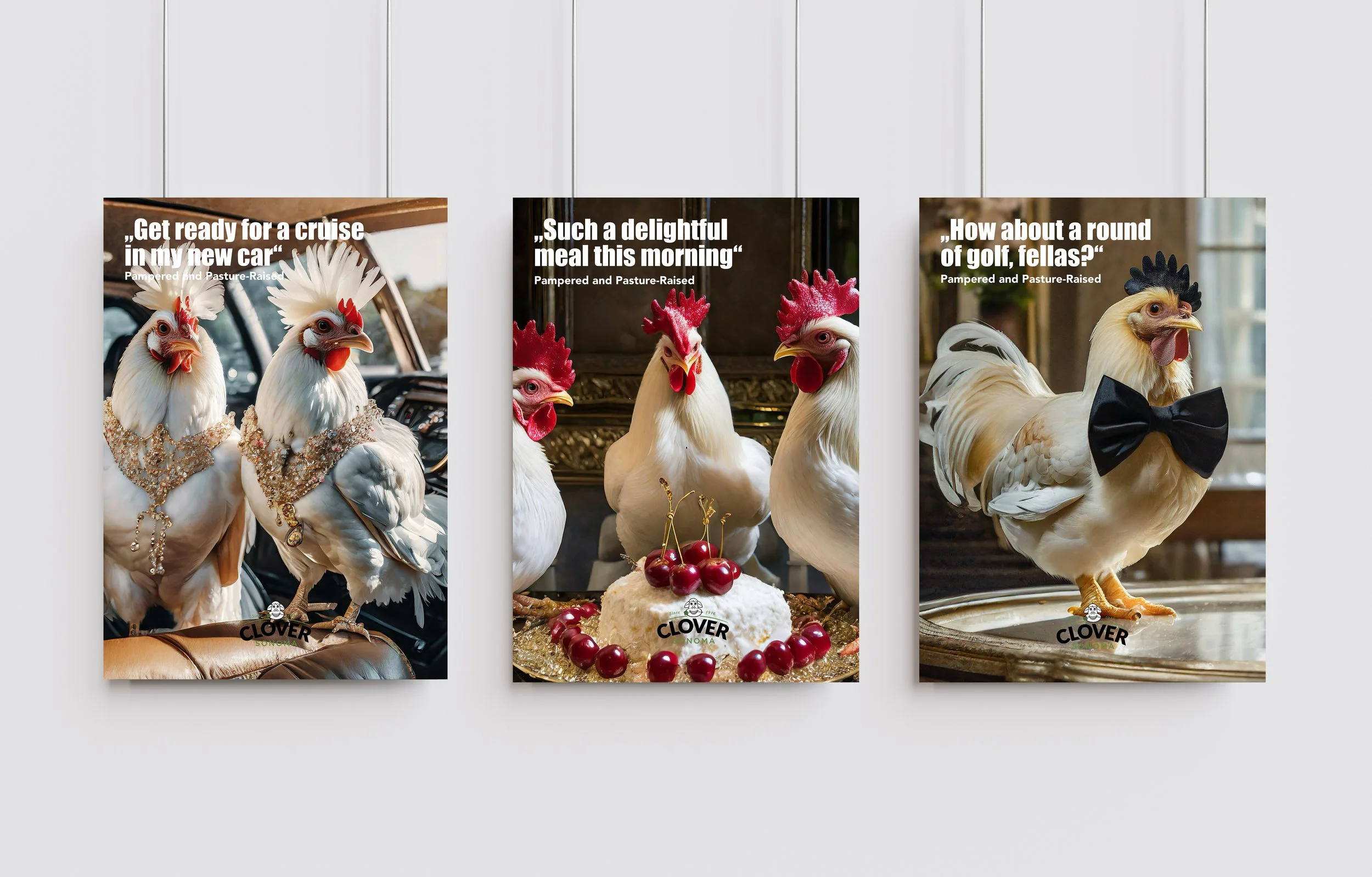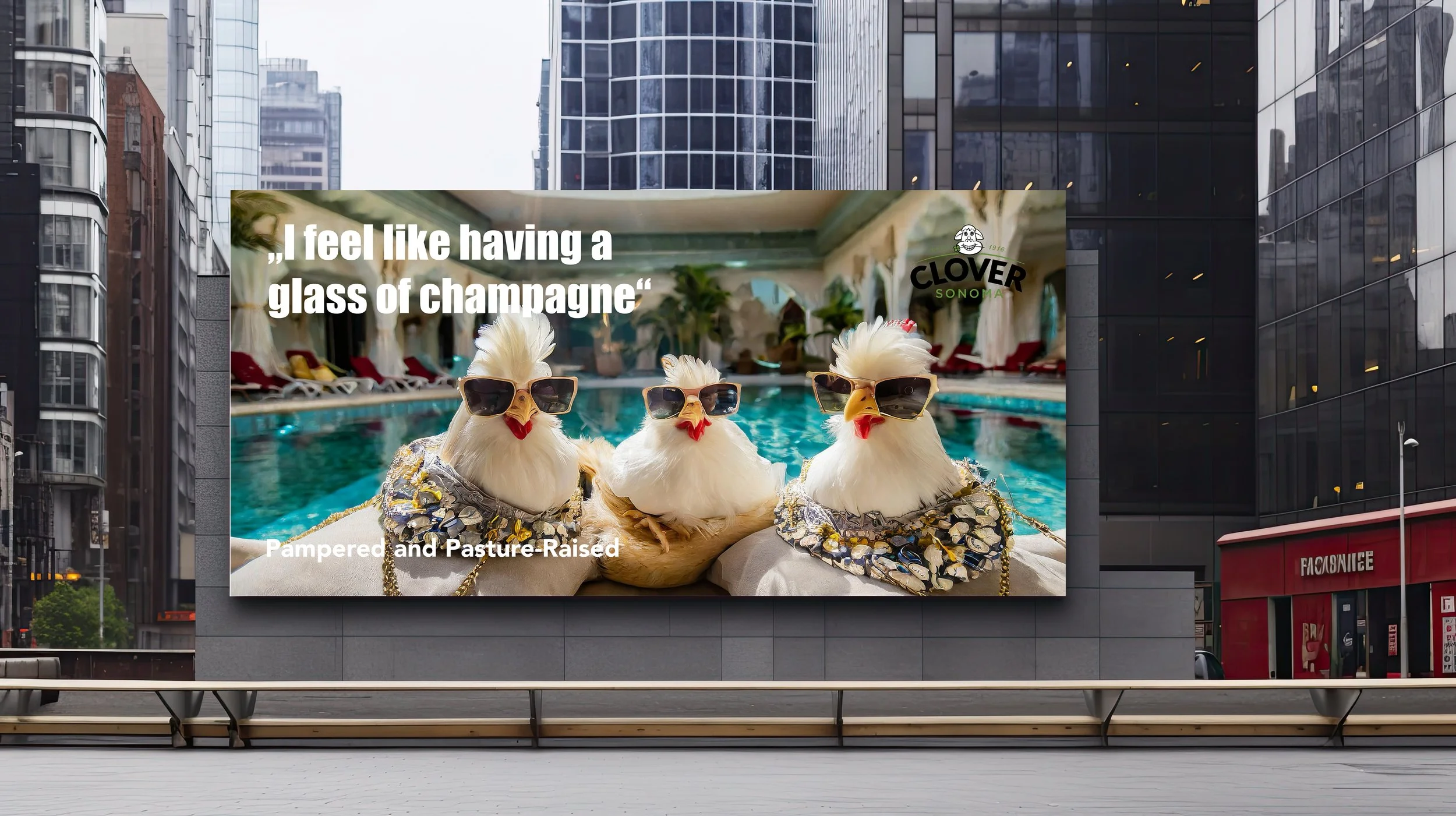 The Clover Sonoma ad campaign creatively positioned the brand’s pasture-raised eggs as a luxurious choice, emphasizing animal welfare and ethical farming. By portraying chickens in a high-end, pampered setting, the campaign delivered a witty yet impactful message on fair treatment and quality. The tagline "Pampered and Pasture-Raised" highlighted the brand’s commitment to ethical sourcing while resonating with conscious consumers. Successfully executed across multiple channels, the campaign won an advertising award at the SF ADDYs, showcasing its effectiveness in blending humor, storytelling, and brand values to drive engagement.